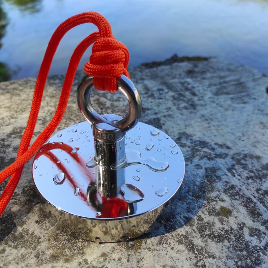 A kötél megkötésére szolgáló szem, a durva polírozott bevonat és a mágneses erő a mágnes aktív oldalába való koncentrálása miatt ideális eszköz a vízben rejlő fémkincsek megtalálására.